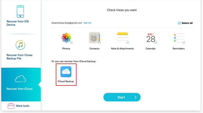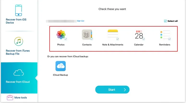Cochez les cases correspondant aux types de données que vous souhaitez restaurer depuis iCloud (Contacts, Notes et Pièces jointes, Rappels, Photos et Calendriers). Cliquez ensuite sur le bouton « Démarrer » pour lancer l’analyse d’iCloud. Une fois l’analyse terminée, vous verrez tous les types de données analysés dans la barre latérale gauche. Cliquez sur un type de données à gauche pour afficher des informations détaillées à droite. Après avoir confirmé les données à restaurer, sélectionnez-les et cliquez sur le bouton « Restaurer » pour enregistrer les fichiers supprimés d’iCloud sur votre ordinateur.